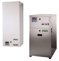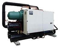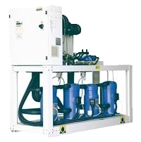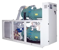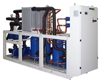 Высокомощные холодильные машины с двухвинтовыми компрессорами и пластинчатыми теплообменниками. Переключение тепло-холод осуществляется путем реверсирования холодильного цикла.