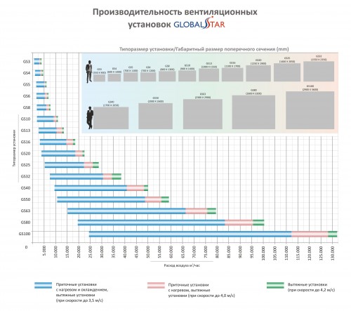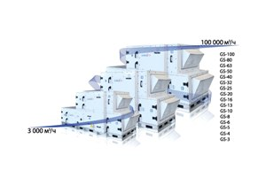 Модельный ряд представлен пятнадцатью типоразмерами производительностью от 3 000 до 100 000 м3 в час.